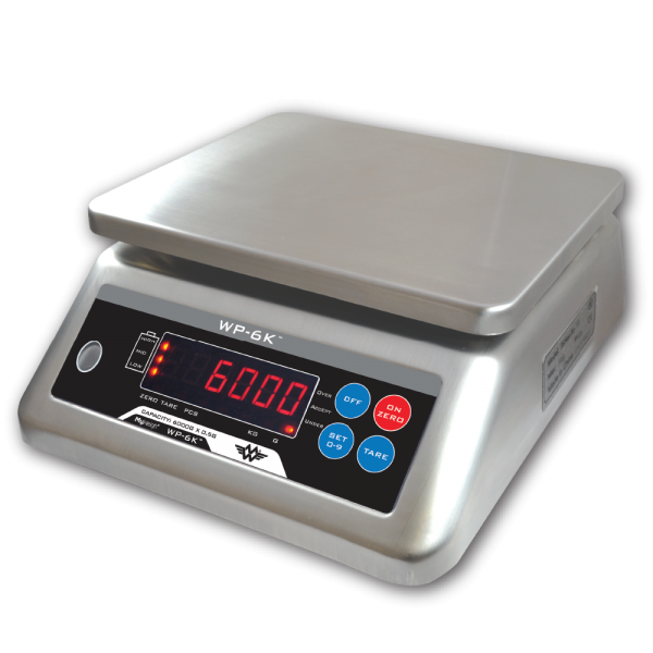 The My Weigh WP6K is a fully waterproof high-capacity bench scale with a dual LED display (front & back) and a rechargeable battery with included adapter. The entire housing of the My Weigh WP6k is made from stainless steel to be IP 68 certified waterproof and protected from outside elements. The WP6K also has a large stainless steel body/bench tray, a high-precision counting feature, programable dual display, advanced counting feature and a rechargeable battery with AC power adapter included.